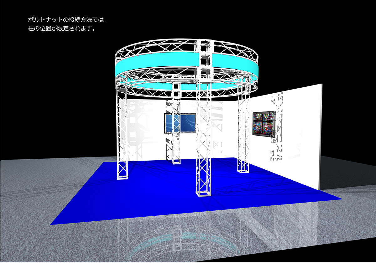 アルミトラスにはクランプ式とボルト式の2つのタイプがあり、弊社ではレンタル材としてはクランプ式を取り扱っています。
